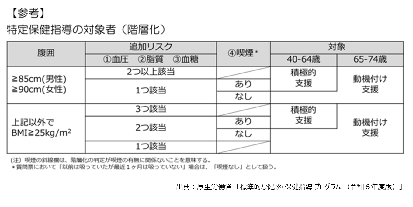 これらの基準に該当した場合、次に血圧や血液データの数値、喫煙の有無などをもとに支援の種類が決まります。