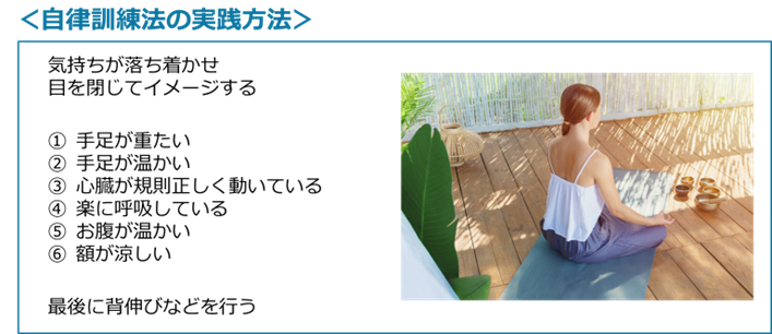 その他に自律訓練法というリラックス方法もあります。自律訓練法は自己暗示によって、不安や緊張感を緩和させ、筋肉の緊張を緩め、自律神経の働きを整える方法です。椅子に座るなど楽な姿勢で、落ち着いて行うことができる静かな環境が必要です。