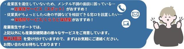 当社では、産業医・保健師による面談や、職場全体へのメンタルヘルス支援を行っています。詳細についてはお気軽にご相談ください。